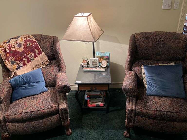 LOT 94 - Side Table, Lamp, Contents of Table , Arm Chairs