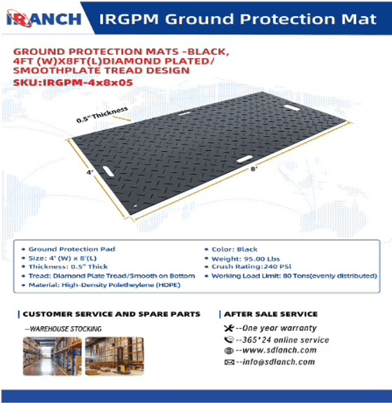 IRGPM Ground protection Mat GROUND PROTECTION MATS -BLACK4FT(W)X8FT(L)DIAMOND PLATED/SMOOTHPLATE TREAD DESIGN SKU:IRGPM:4x8x05 Thickness Ground Protection pad Size:4'(W)x 8'(L) Thickness: 0.5" Thick Color: Black Weight: 95.00 Lbs eCrush Rating:240 PSl Tread: Diamond Plate Tread/Smooth on BottomWorking Load Limit: 80 Tons(evenly distributed)C. Material: High-Density Poletheylene (HDPE)