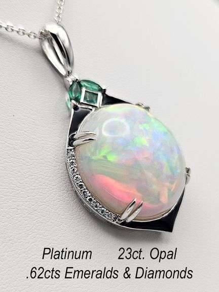 LOT 104 - Platinum 23 CT. Opal Pendant w/ Emeralds
